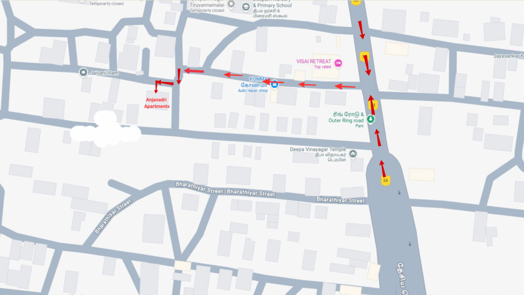 If you are coming on NH38 (Tiruvannamalai Bypass Road) from Chennai, Salem, Villupuram, or Tirukovilur, take the first left after passing the Deepa Vinayagar temple.